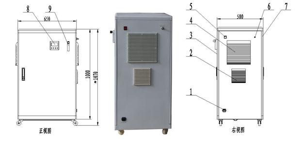 1.电源接口 2.风机罩 3.前门 4.风机罩 5.开关 6.臭氧出气口 7.后门 8.LCD控制器 9.流量计