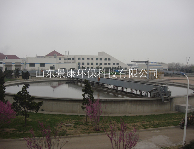 污水从池中心的进水管经导流筒扩散后,均匀地向周边呈辐射状流出,呈悬浮状的污泥经沉淀后沉积于池底,上清液通过溢流堰板由出水槽排出池外,污泥刮板由池周刮向中心集泥槽,依靠池内水压通过排泥管排出池外。主梁在周边驱动装置的带动下,以中心旋转支座为轴心沿池顶以2.0m/min线速度行驶,主梁下部连接支架、污泥刮泥板等。近液面处设置浮渣刮板,沿中心稳流筒延伸至铰链式刮渣耙,当主梁旋转时,浮渣刮板将液面的浮渣由池中心撇向池周,收集在铰链式刮渣耙区内,收集的浮渣随主机在池周运动至撇渣斗,通过刮渣耙的铰链活动刮至撇渣斗内,排至池外。